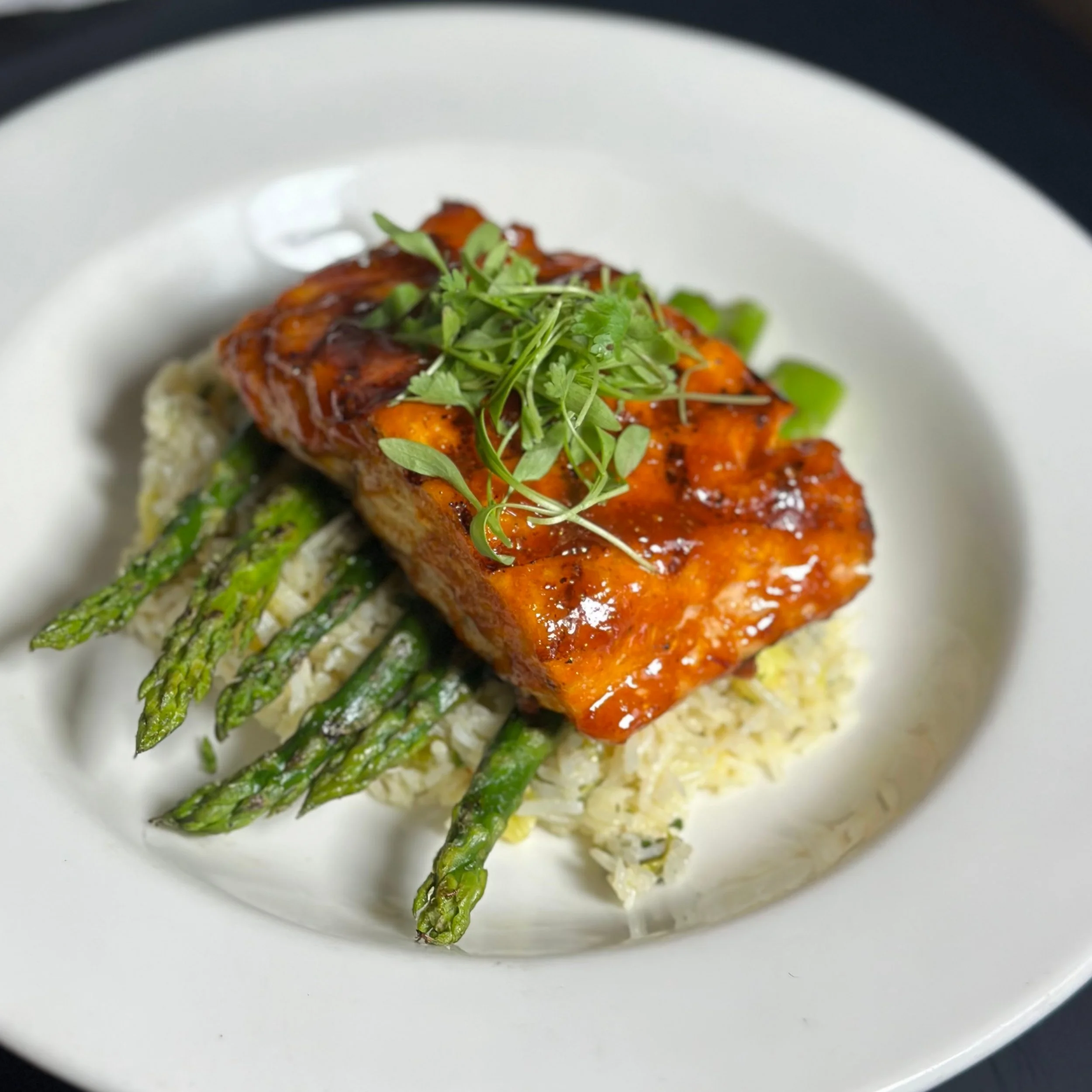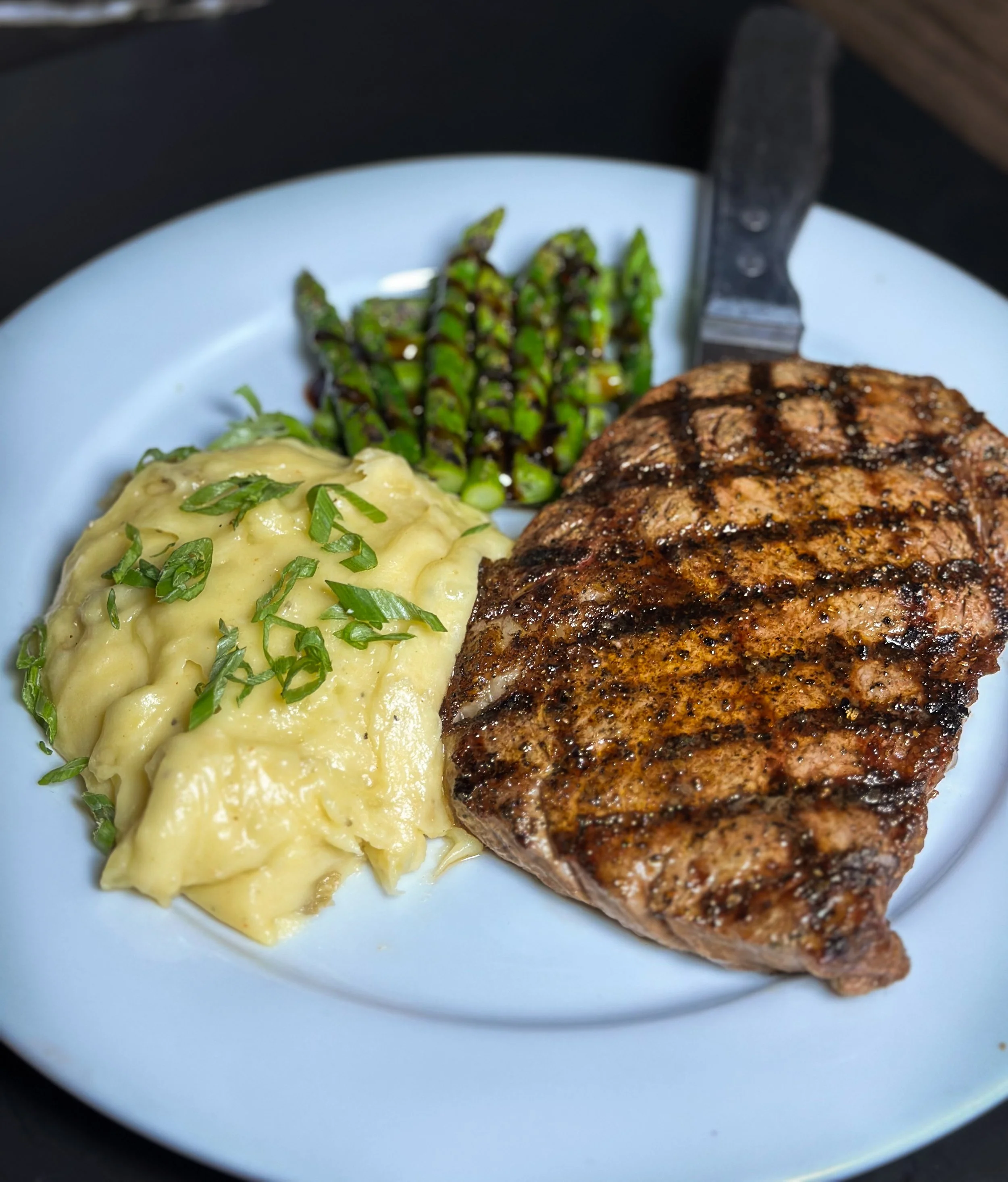 14oz premium ribeye, white cheddar mashed potatoes, grilled asparagus