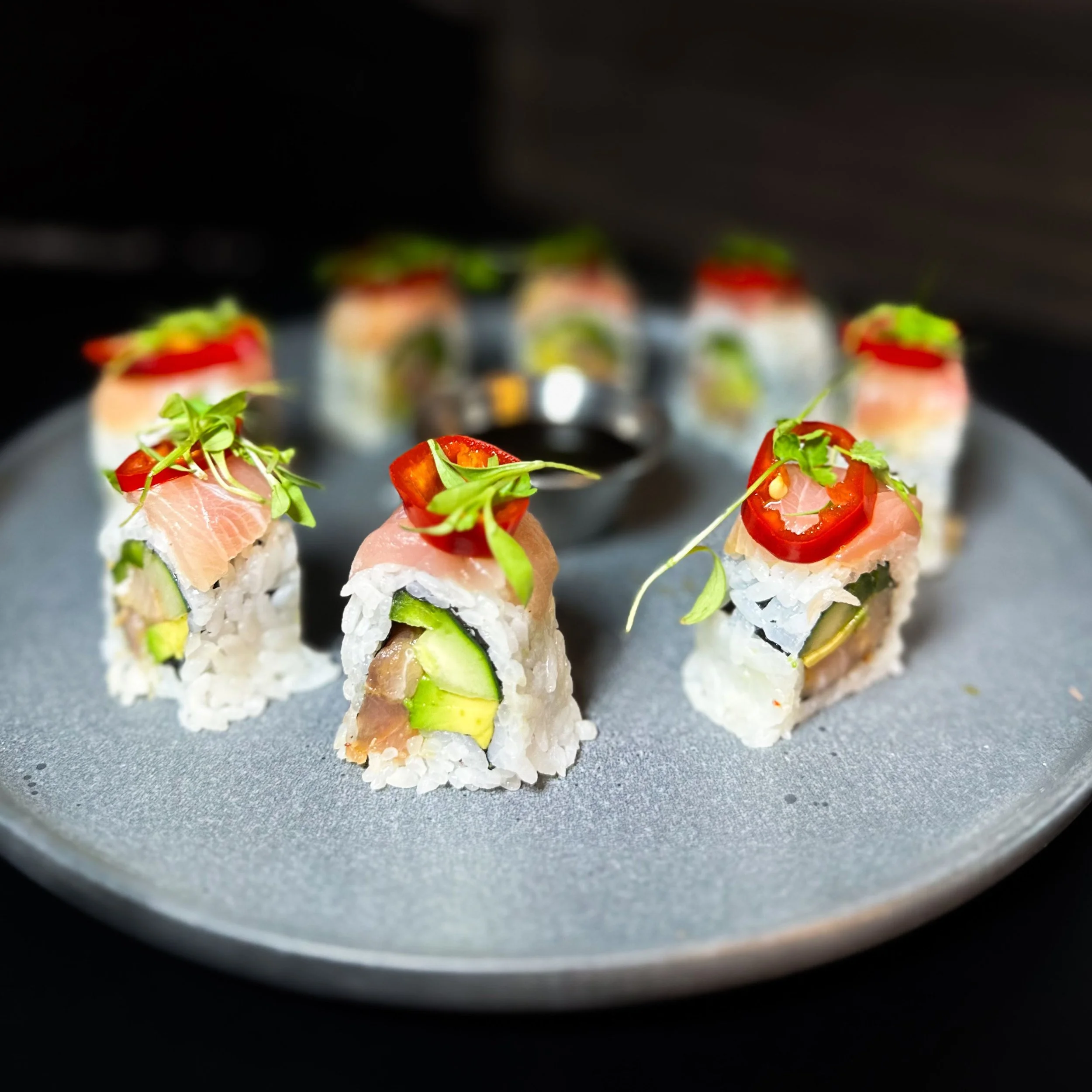 spicy tuna, yellowtail, avocado, habanero cream cheese, jalapeño, tobiko, sriracha, eel sauce, spicy aioli, atomic sauce