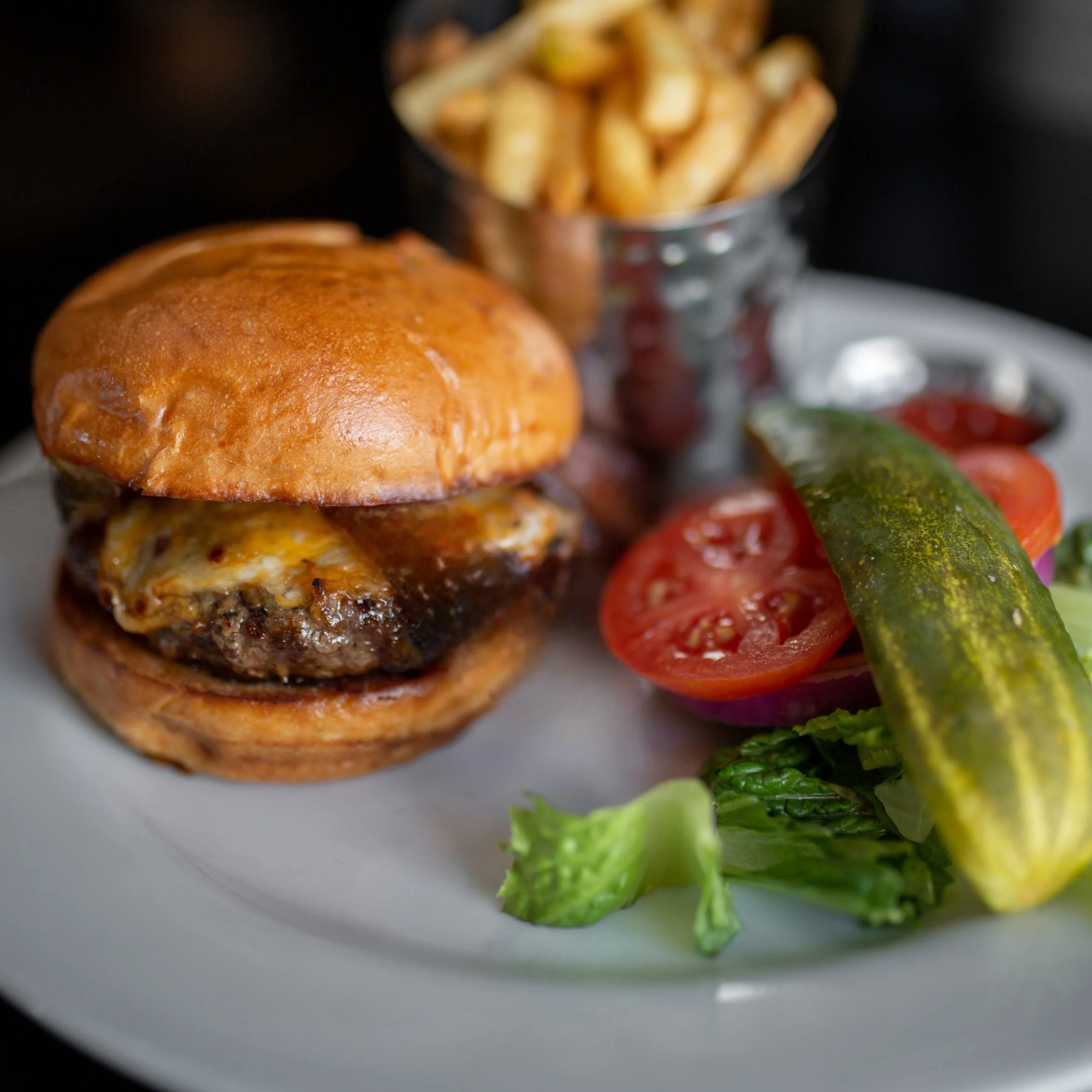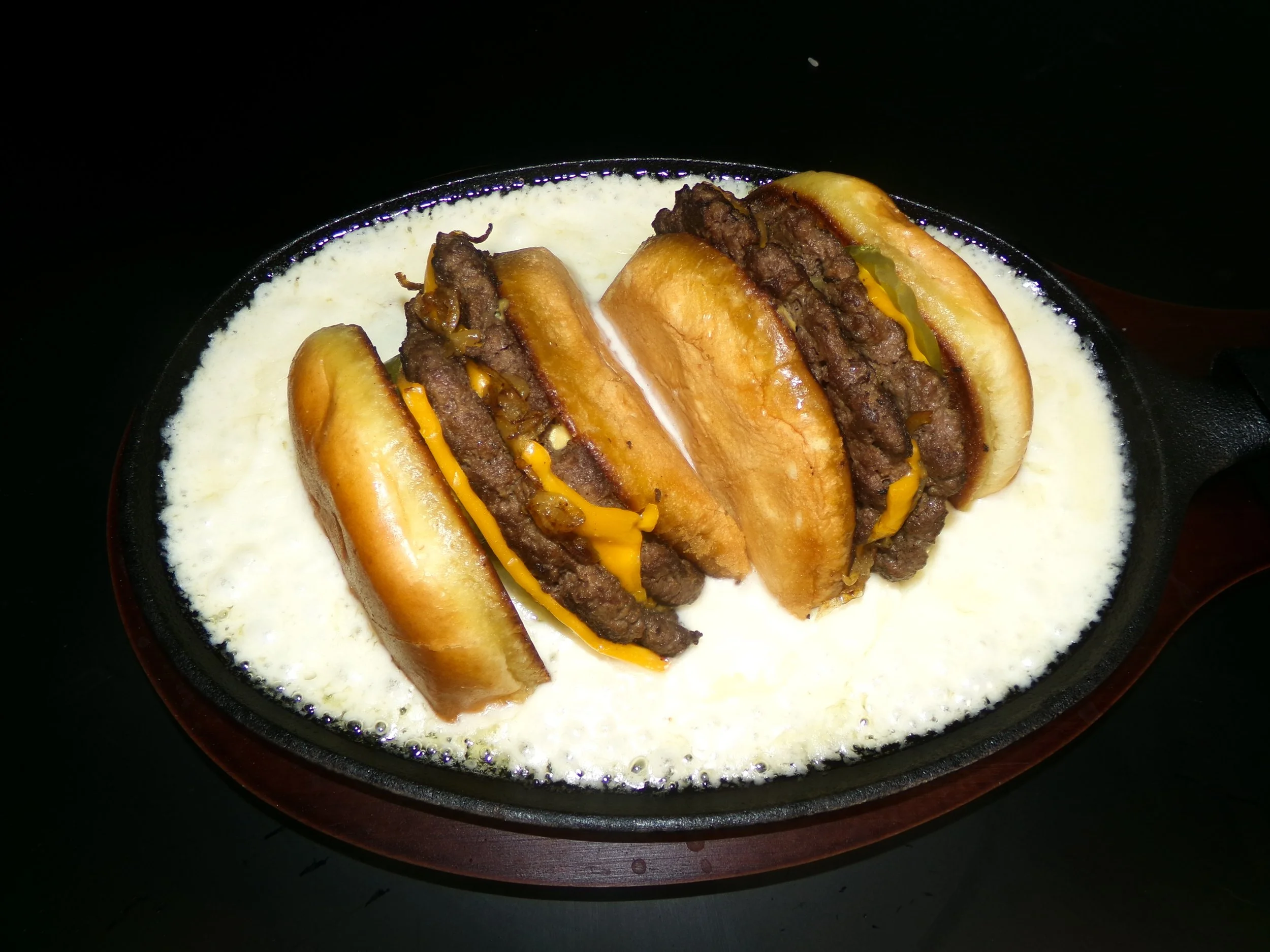 melted american cheese, caramelized onion, pickles, dijon, cut in half and served sizzling in a skillet with bubbly white cheddar