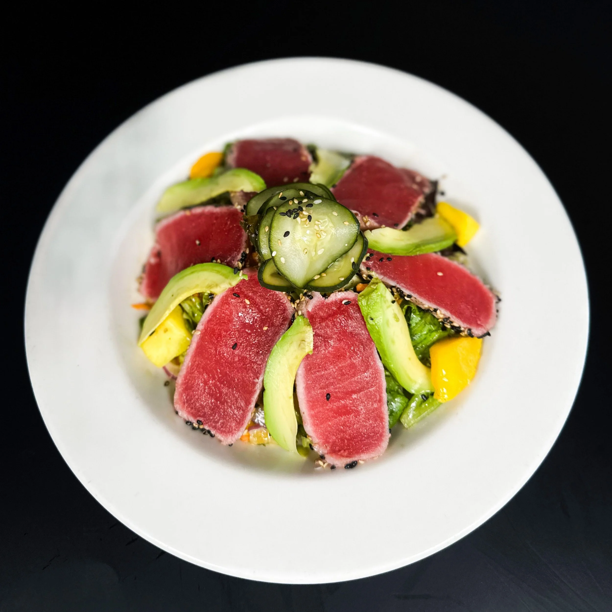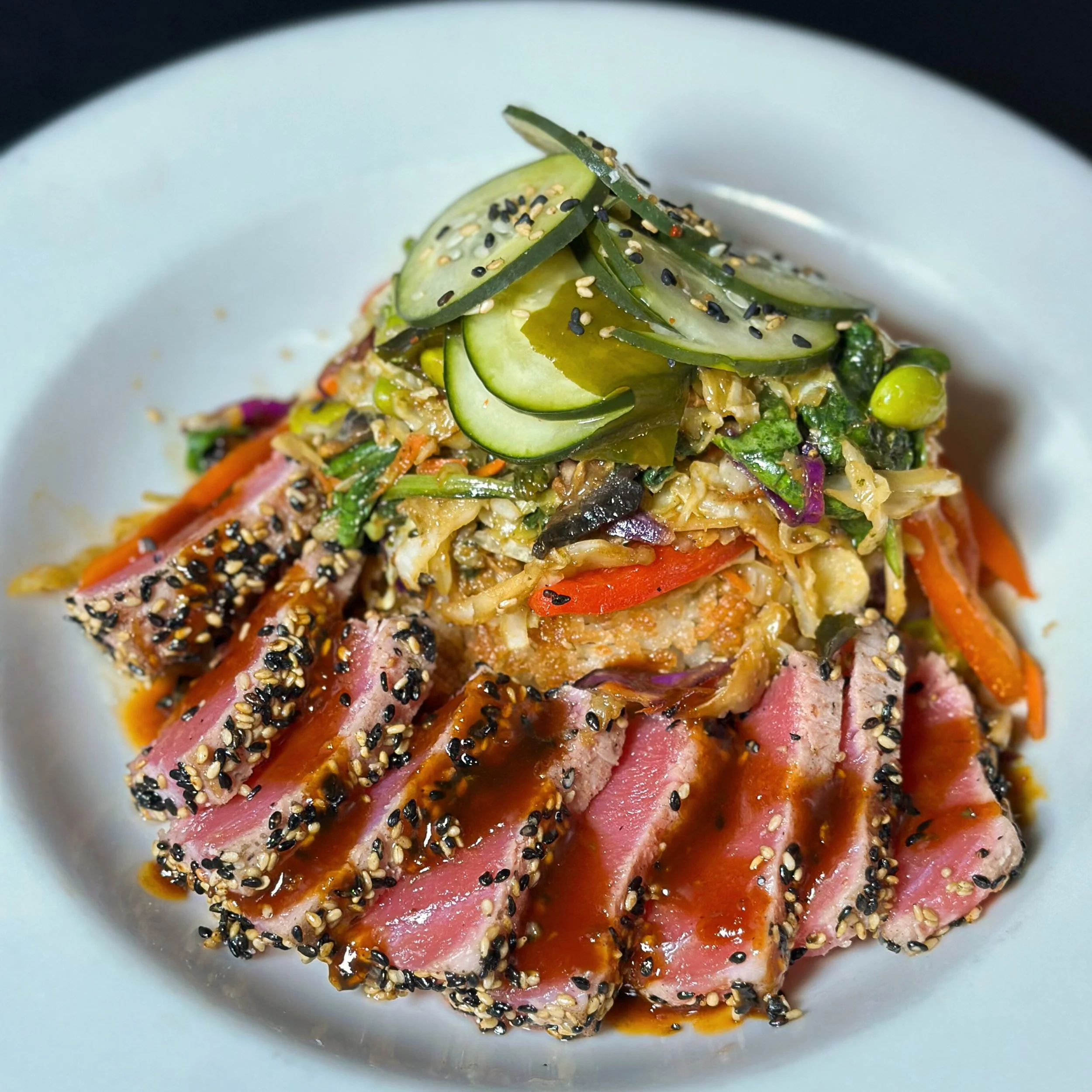 sesame-crusted ahi, avocado, spring mix, cabbage, edamame, red onion, carrot, cucumber, sunomono, asian sesame dressing