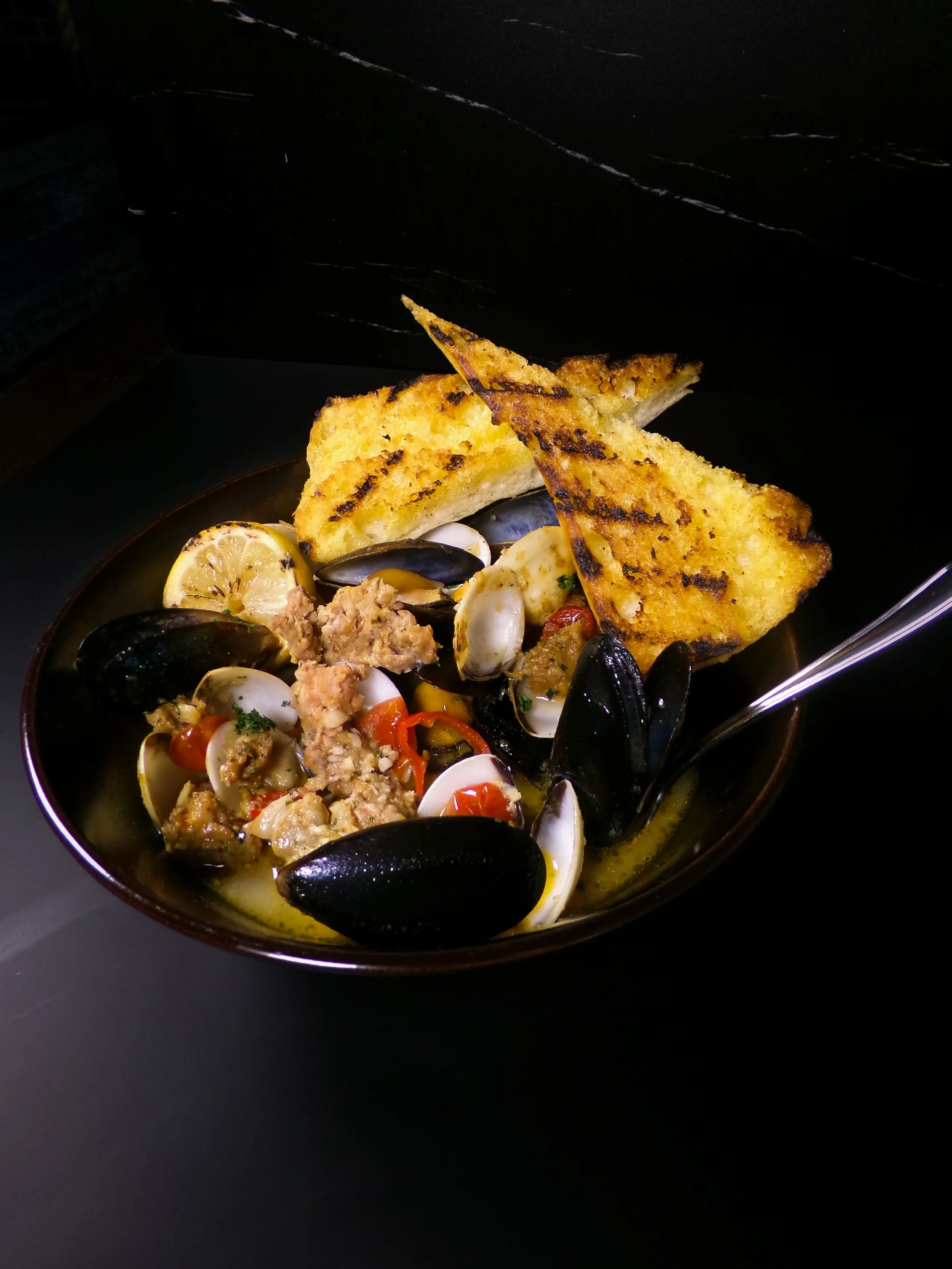 white wine, citrus herb butter, tonkotsu broth, blistered tomato, fresno, parsley, garlic bread