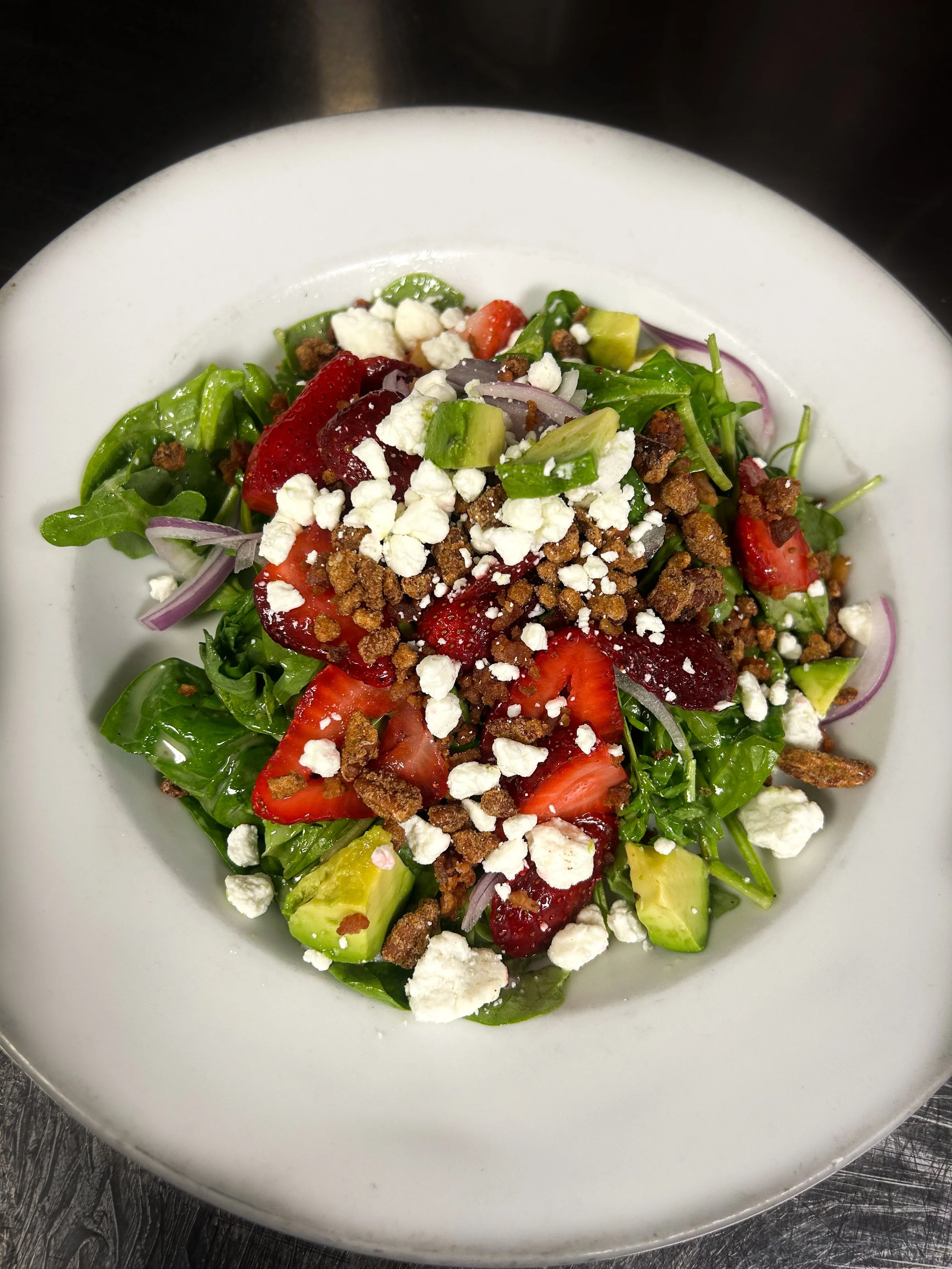 Spinach, arugula, candied pecans, goat cheese, shaved red onion, strawberry, avocado, bacon, white balsamic