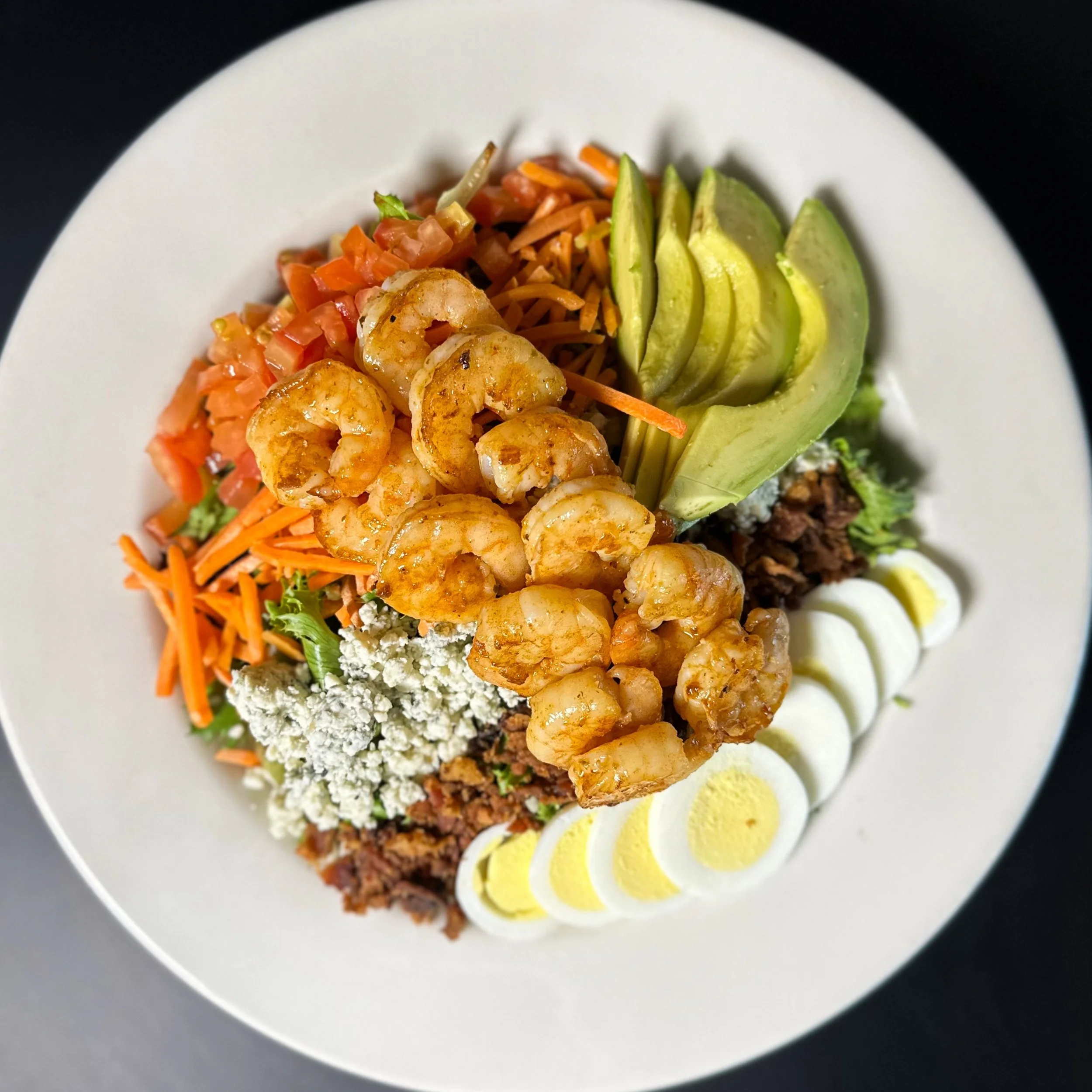 Tequila-lime shrimp or grilled chicken, mixed greens, tomato, carrot, hardboiled egg, bacon, bleu cheese, avocado.