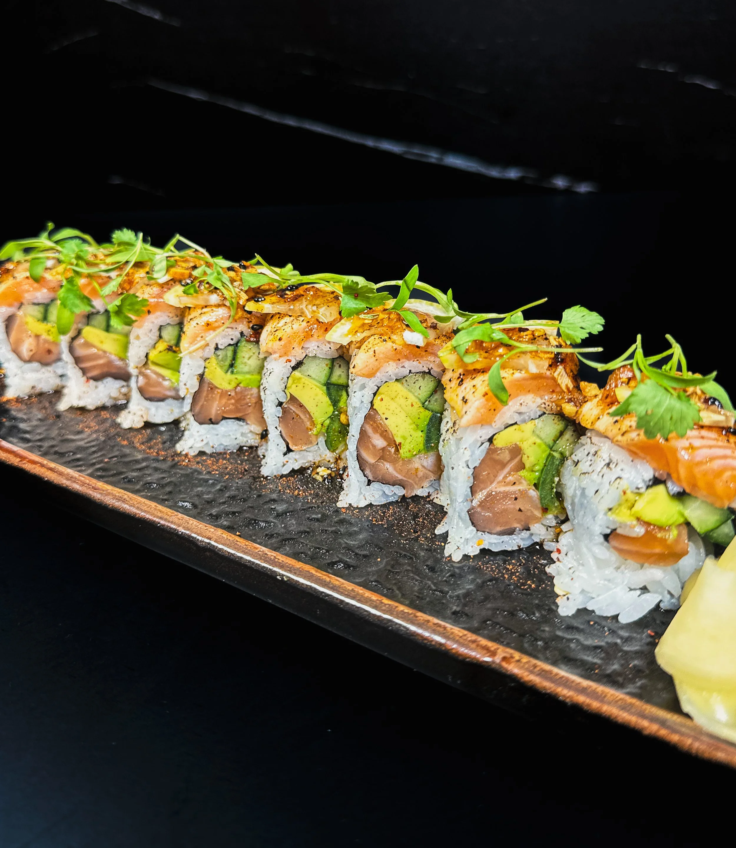 Ahi, salmon, avocado, yellowtail, shrimp, surimi crab & lobster, cucumber, cilantro, key lime aioli, sriracha, soy paper