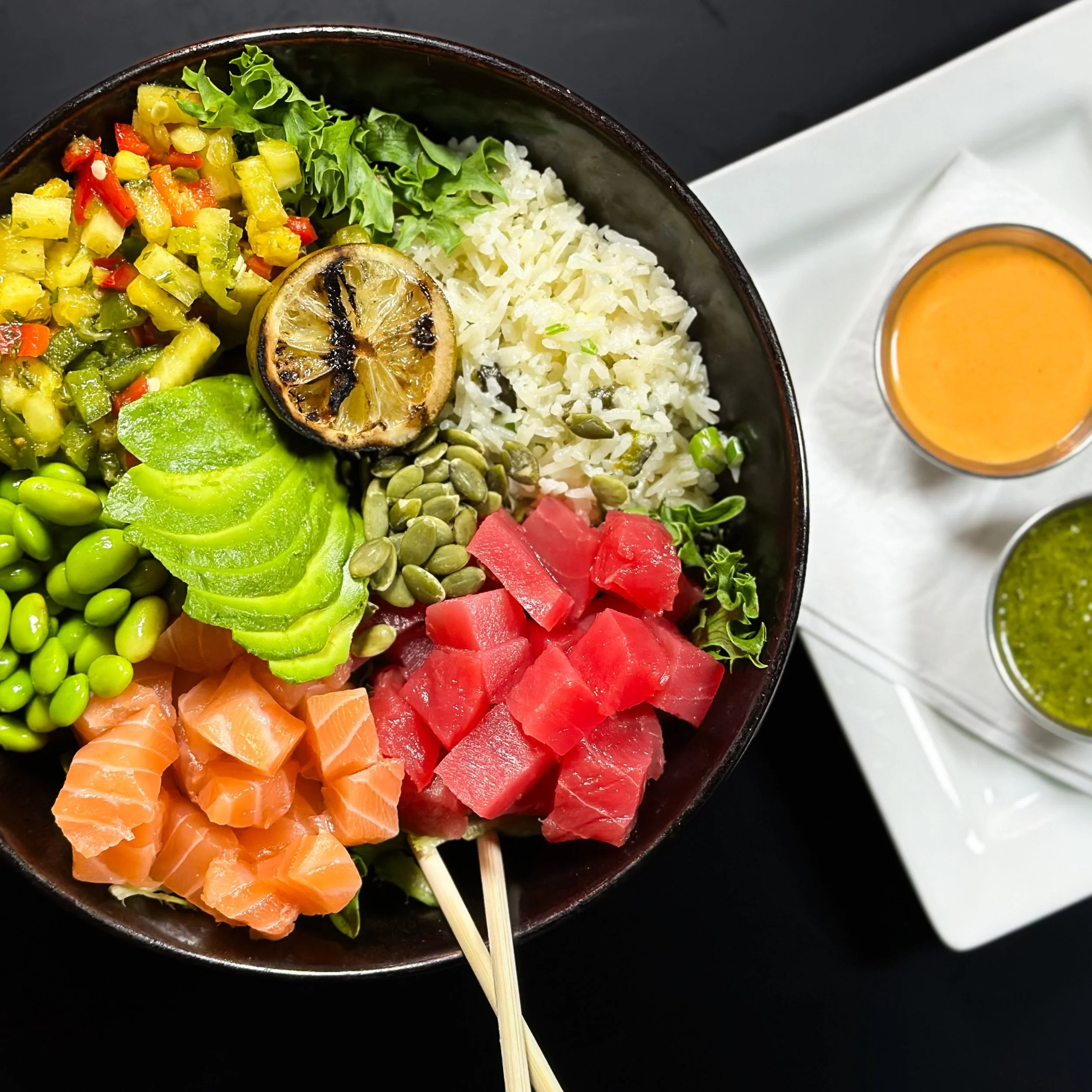 raw diced salmon, ahi, avocado, pineapple jalapeño & red pepper salsa, edamame, pepitas, mixed greens, warm cilantro lime rice