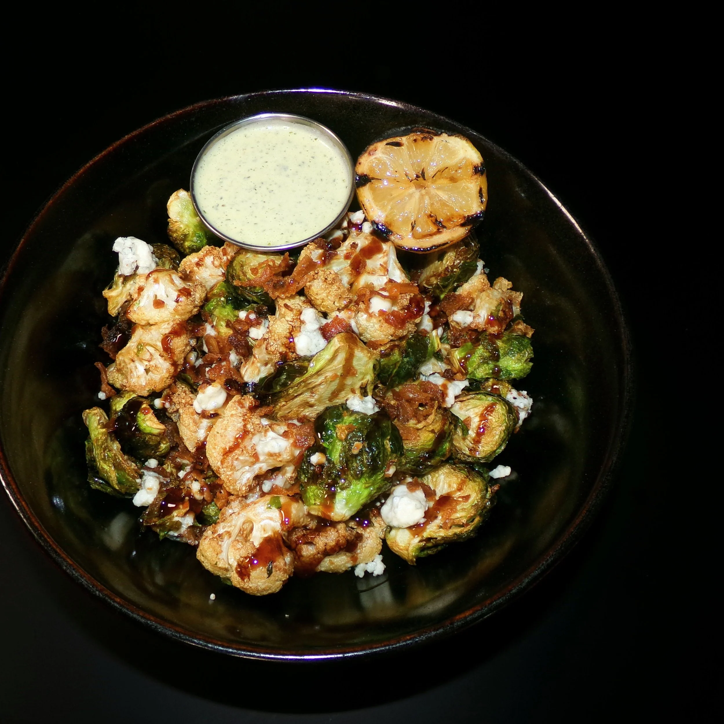 arugula slaw, goat cheese, lemon caper cream, cilantro lime rice, chili garlic oil